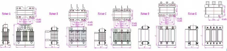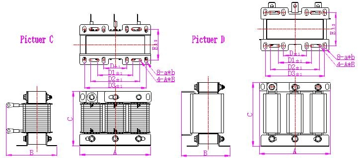 產(chǎn)品型號 | 繞組材質(zhì) | 電流 | 電壓 | 電壓降 | 適配變頻器功率 | 圖號 | A | B | C | D3 | E |