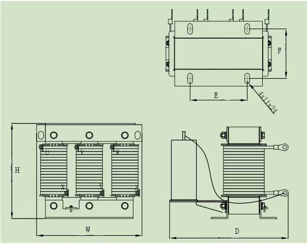 產品型號 | 額定電流 | 電感量 | 壓 降 | 適配變頻器功率 | W | D | H | E | F |