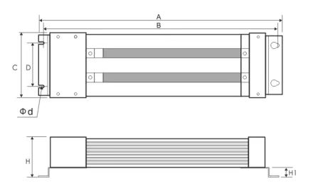 型號、功率 | 聯體規格 | A(±5)mm | B(±5)mm | C(±3)mm | D(±2)mm | H(±3)mm | H1(±3)mm | Φd(mm) | 配線 (mm2) | 引線長度 (mm) |